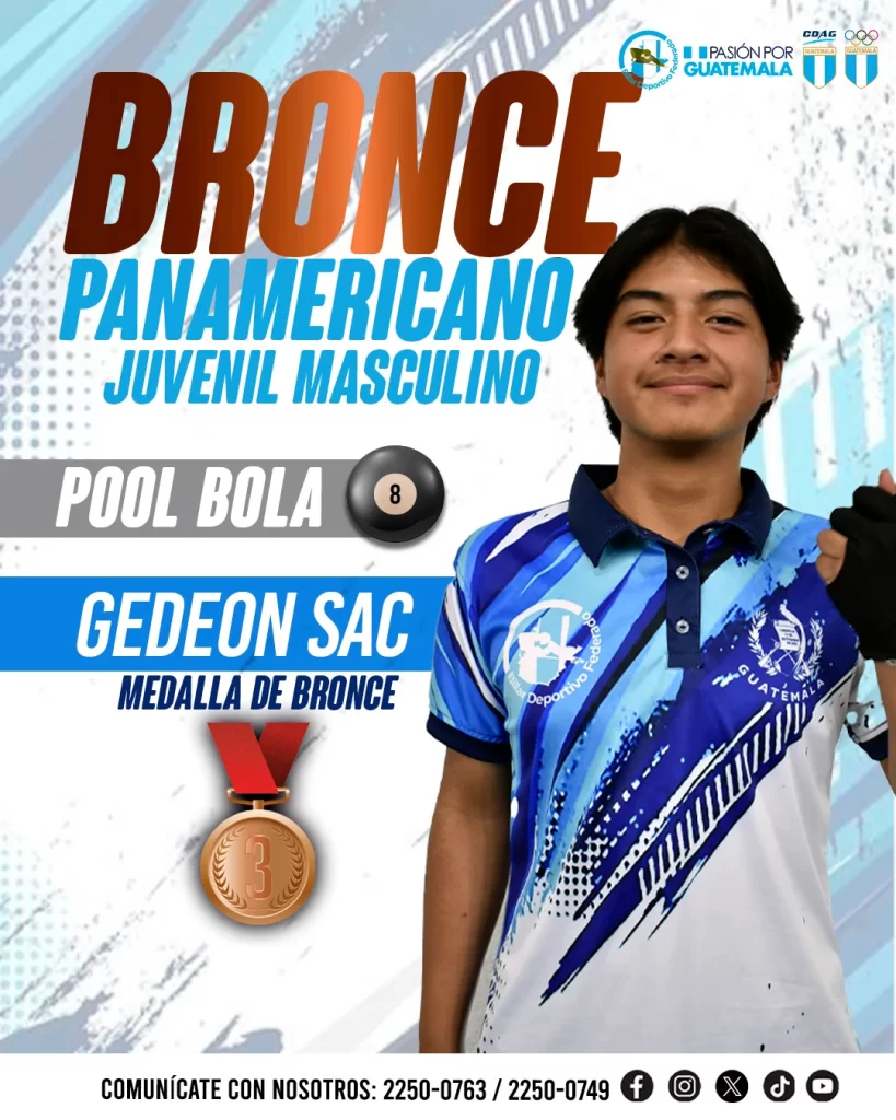 El joven talento Gedeon Sac, integrante del programa juvenil de billar federado en Guatemala, escribió una página memorable en su primera participación internacional, al conquistar la medalla de bronce en la modalidad de Pool Bola 10, categoría juvenil, en el Campeonato Panamericano 2025.